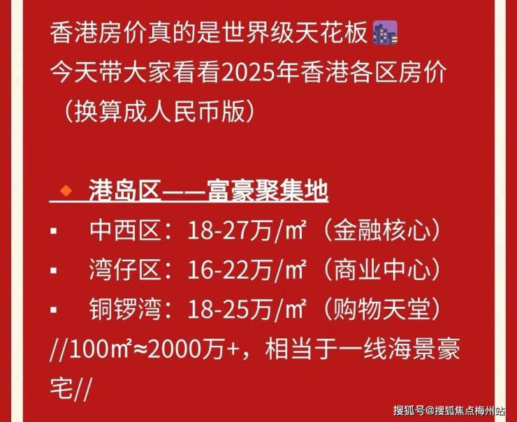先看香港房价的“金字塔尖”——港岛区,这里是公认的富豪聚集地,每一寸土地都彰显着稀缺价值。中西区作为金融核心,聚集了中环、半山等顶级地段,香港房价高达18-27万/㎡,若是一线海景的豪宅项目,单价甚至能突破30万/㎡。湾仔区依托商业中心优势,房价维持在16-22万/㎡,而铜锣湾作为“购物天堂”,18-25万/㎡的价格对应着成熟的商业配套与便捷交通。在港岛区,100㎡的住宅总价普遍超过2000万人民币,这样的户型多为一线海景豪宅,是高净值人群资产配置的首选。