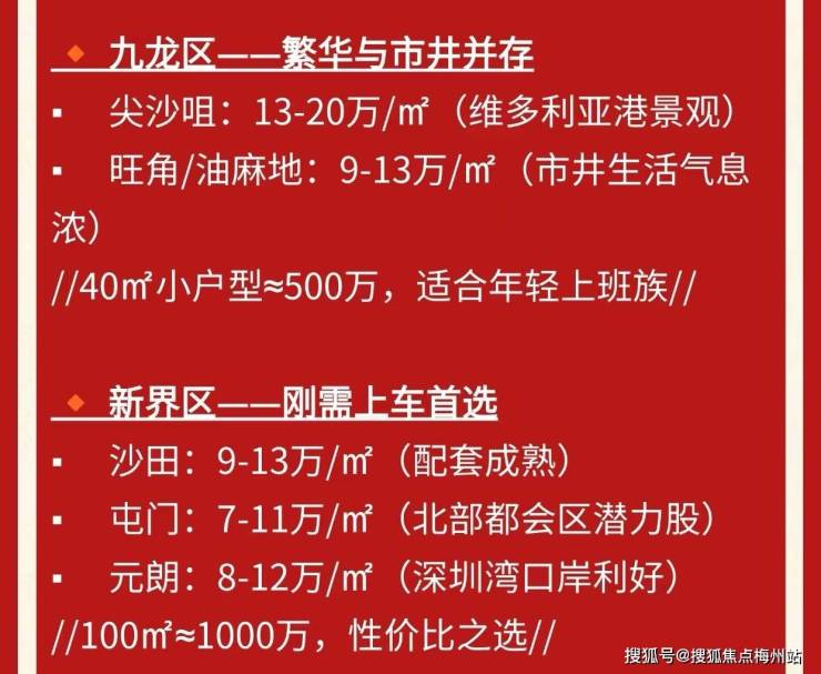 九龙区则呈现“繁华与市井并存”的独特气质,香港房价的梯度差异更为明显。尖沙咀凭借维多利亚港的绝美景观,房价在13-20万/㎡之间,地铁上盖的小户型因兼具居住与投资属性,备受市场青睐。而旺角、油麻地等区域充满市井生活气息,9-13万/㎡的价格相对亲民,一套40㎡左右的小户型总价约500万人民币,成为年轻上班族扎根香港的热门选择。九龙城区因优质学区资源加持,房价略高但需求稳定,观塘区则凭借旧区转型红利,吸引了不少追求性价比的购房者。