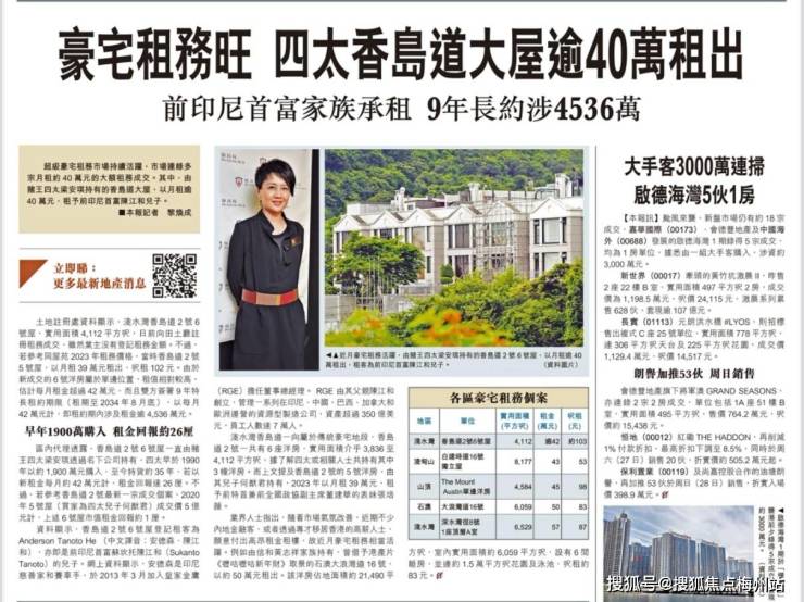 最近香港豪宅圈的一则消息刷爆了地产圈——赌王四太梁安琪持有的香岛道2号6号屋,以每月42万港元的价格租给了前印尼首富陈江和之子Anderson Tanoto,更让人惊叹的是这份租约长达9年,总租金算下来足足有4536万港元。这组数字不仅印证了香岛道作为老牌豪宅区的价值,更揭开了香港超级豪宅租务市场的活跃真相。