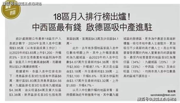 香港统计处公布的18区住户入息统计数字,如同一面棱镜,折射出香港房产市场的复杂图景。2024年全港入息中位数达$3.95万,较2023年稳步上升。这一经济数据的波动,与香港各区域房产市场的定位、客群流向紧密关联。透过收入排行,我们得以探寻香港房产市场的区域发展逻辑。
