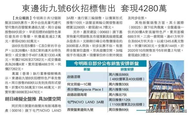 在香港这座国际金融大都市,香港楼市一直是投资者瞩目的焦点领域。近期,香港楼市又迎来新的热度高潮,众多新盘的销售动态备受关注,其中由佳兆业代建代管代售的西营盘东边街九号表现尤为亮眼,其6伙招标售出,套现4280万的消息,再次为香港房产投资市场注入活力,也为关注香港买房投资、香港房子价值挖掘的人士提供了新的观察视角。