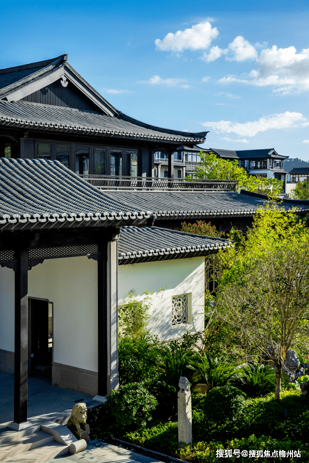 在融合江南传统美学上,契合岭南气候变化,出檐深远,大面玻璃窗替代传统粉墙,可以感受到留香苑与其他中式别墅的不同韵味。