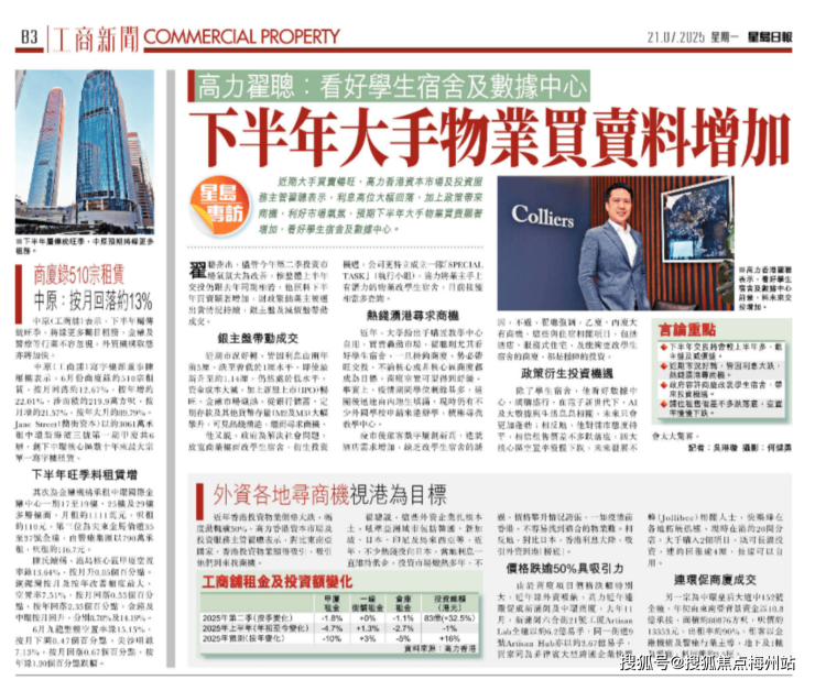 最近看了星岛日报的报道,发现香港物业市场下半年要热闹起来啦!高力的翟聪说看好学生宿舍和数据中心,这俩领域要爆发,大手物业买卖要变多,不管是想投资的,还是想了解市场的,都得好好看看。
